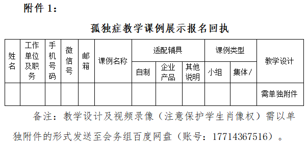 課例類型不限(不建議個訓(xùn),鼓勵集體或小組課,盡量使用相關(guān)教具、學(xué)具或輔具)。鼓勵老師們自己制作輔具,不容許出現(xiàn)廠家名字或任何企業(yè)標(biāo)志及信息。參加單位需同時提供輔具名稱和孤獨癥學(xué)生的教學(xué)設(shè)計方案及視頻錄像(注意保護(hù)學(xué)生肖像權(quán)),MP4格式,確保視頻清晰,總時長20-35分鐘,主要與孤獨癥相關(guān)的教學(xué)內(nèi)容與過程要在屏幕上有文字顯示。成果一經(jīng)征集,頒發(fā)證書。