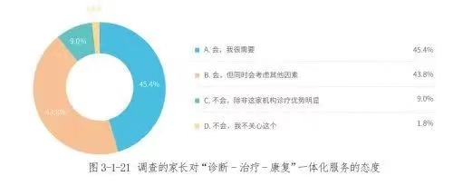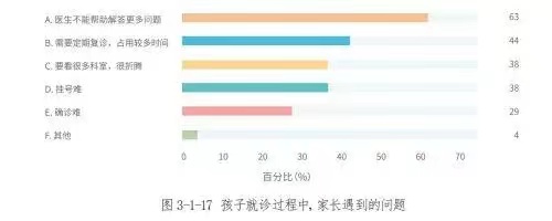 例如,當問及診療過程中的困難時,63%的家長認為,“醫(yī)生不能解答更多問題”,是就診過程中遇到的最多的困難,44%的家長認為,“需要定期復診,占用較多時間”。“醫(yī)生不能解答更多問題”的原因可能是,兒童發(fā)展障礙的共患病問題較多,很多情況下,單一科室的醫(yī)生難以給予精準的診斷治療,因此,需要多學科間的協(xié)作。