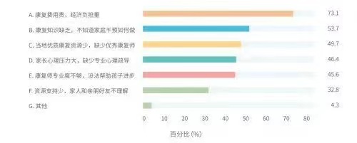 總體來看,康復費用貴、康復資源少,服務質(zhì)量不夠高是家長們普遍面臨的問題。《藍皮書》顯示,73.1%的家長認為“康復費用貴,經(jīng)濟負擔重”是主要困難。其次是“康復知識缺乏,不知道家庭干預如何開展”,占比 53.7%,以及“當?shù)貎?yōu)質(zhì)康復資源少,缺少優(yōu)秀康復師”占比 49.7%。
