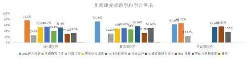 可喜的是,兒童康復行業(yè)已經(jīng)展現(xiàn)出多學科精準康復的趨勢。從兒童康復師學習需求的角度來看,也呈現(xiàn)出多學科融合發(fā)展的趨勢。其中,在所調(diào)查的兒童康復師中,76.3%的ABA治療師希望學習言語語言治療技術,占比近8成;72.1%的言語治療師希望學習ABA行為分析技術,占比超過7成;同時,分別有66.7%和62.3%的作業(yè)治療師希望學習言語語言治療和ABA行為分析技術,超過6成。在兒童康復學科越發(fā)細分,越發(fā)專業(yè)的同時,學科融合的趨勢也越加明顯。