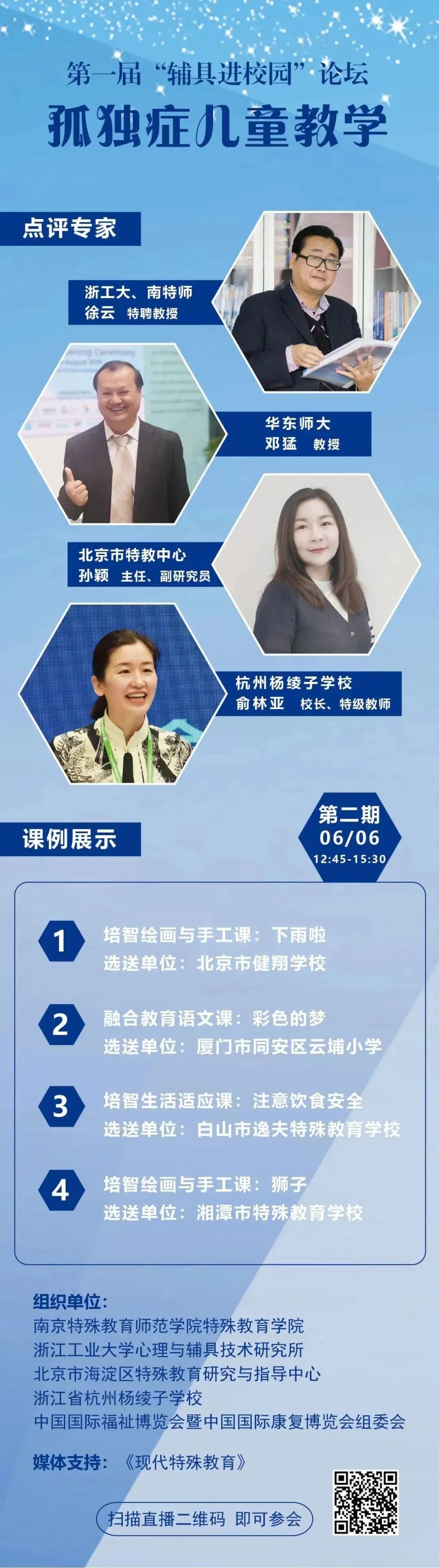 為配合實(shí)施中國(guó)殘聯(lián)、教育部聯(lián)合發(fā)布的《輔助器具進(jìn)校園工程實(shí)施方案》,中國(guó)國(guó)際福祉博覽會(huì)暨中國(guó)國(guó)際康復(fù)博覽會(huì)組委會(huì)聯(lián)合南京特殊教育師范學(xué)院特殊教育學(xué)院、浙江工業(yè)大學(xué)心理與輔具技術(shù)研究所、北京市海淀區(qū)特殊教育研究與指導(dǎo)中心、浙江省杭州楊綾子學(xué)校等“輔具進(jìn)校園”會(huì)議籌備組主辦的“輔具進(jìn)校園”論壇四之“孤獨(dú)癥兒童教學(xué)”主題活動(dòng)擬于2023年6月6日(周二 12:45-16:00)組織召開(kāi)。具體如下: