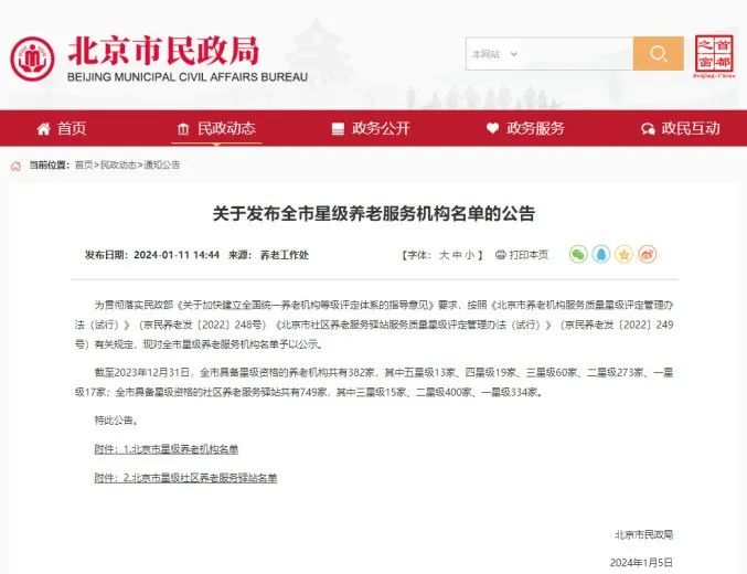 1月11日,北京市民政局發(fā)布《北京市星級養(yǎng)老服務(wù)機構(gòu)名單》。截至2023年12月31日,全市具備星級資格的養(yǎng)老機構(gòu)共有382家,其中五星級13家、四星級19家、三星級60家、二星級273家、一星級17家;全市具備星級資格的社區(qū)養(yǎng)老服務(wù)驛站共有749家,其中三星級15家、二星級400家、一星級334家。