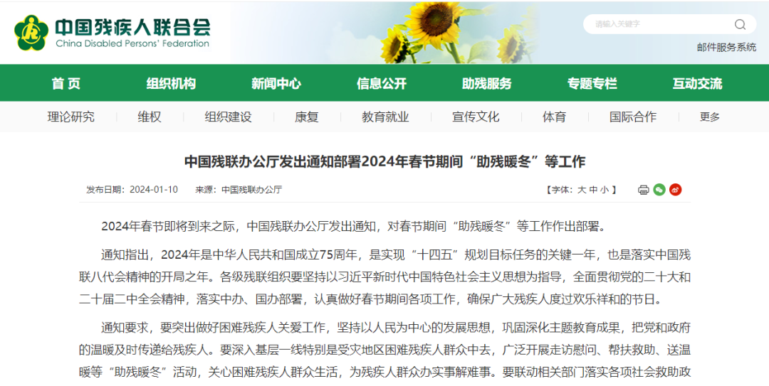 2024年春節(jié)即將到來之際,中國殘聯(lián)辦公廳發(fā)出通知,對春節(jié)期間“助殘暖冬”等工作作出部署,要求各級殘聯(lián)組織認(rèn)真做好春節(jié)期間各項工作,確保廣大殘疾人度過歡樂祥和的節(jié)日。