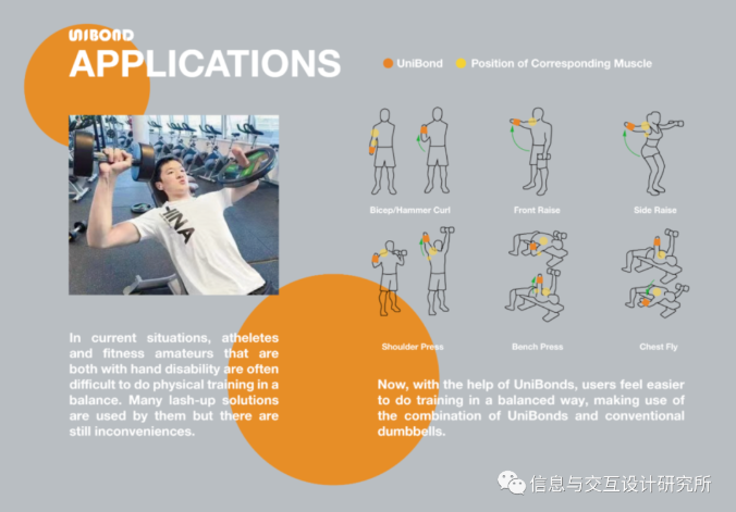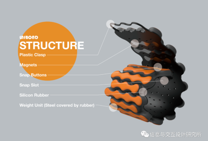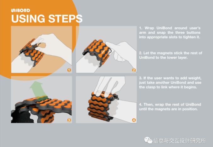 UniBond是一款適合手臂和手部截肢者的健身配重帶。無法雙手同時(shí)握住啞鈴的人,在UniBond的幫助下,仍然可以方便、輕松地進(jìn)行均衡鍛煉。用戶可以用他/她有能力的手將它纏繞在另一個(gè)人的手腕上,然后卡扣和磁鐵使其保持緊密和穩(wěn)定。此外,外觀設(shè)計(jì)和明亮清新的色彩選擇給人以力量和活力的感覺,鼓勵用戶進(jìn)行鍛煉。