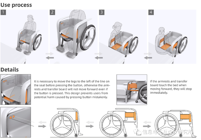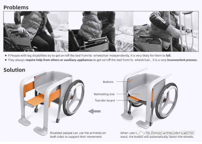通過在輪椅上設(shè)計(jì)可伸收的扶手和轉(zhuǎn)移板,方便腿部殘疾人士不需要他人的幫扶或者輔助器具,利用自身力量挪動就可以自行上下床。這種上下床方式既安全又省力。