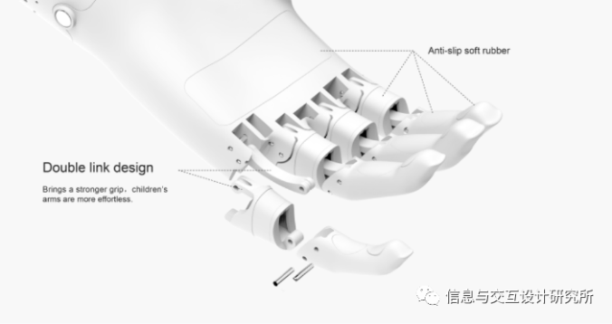 創(chuàng)新的抓握結(jié)構(gòu)更省力抓握性強(qiáng),可調(diào)節(jié)的拉力線松緊結(jié)構(gòu)滿足長時(shí)間使用損耗仍保持最佳驅(qū)動力,采用3D打印生產(chǎn)方式,成本低,且可定制化設(shè)計(jì),舒適的人機(jī)設(shè)計(jì),滿足6-12歲兒童佩戴的舒適性。