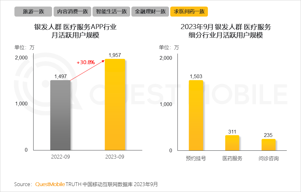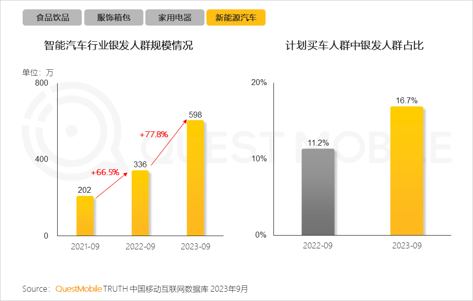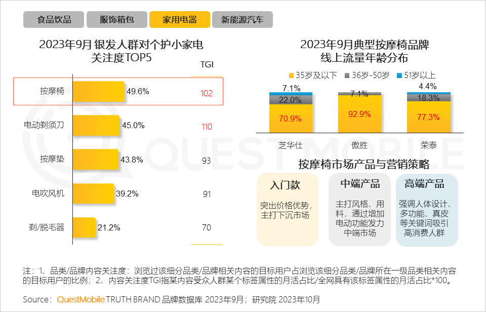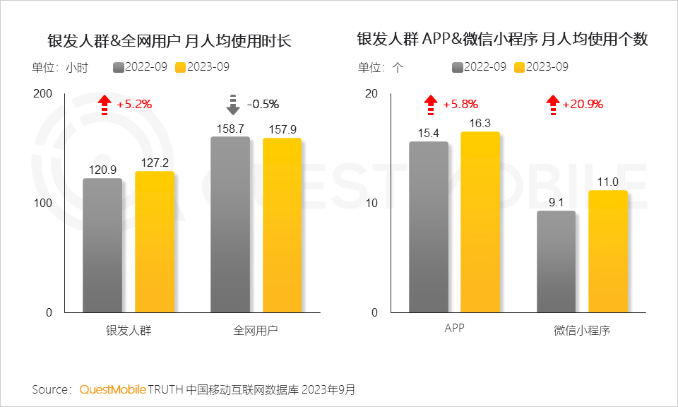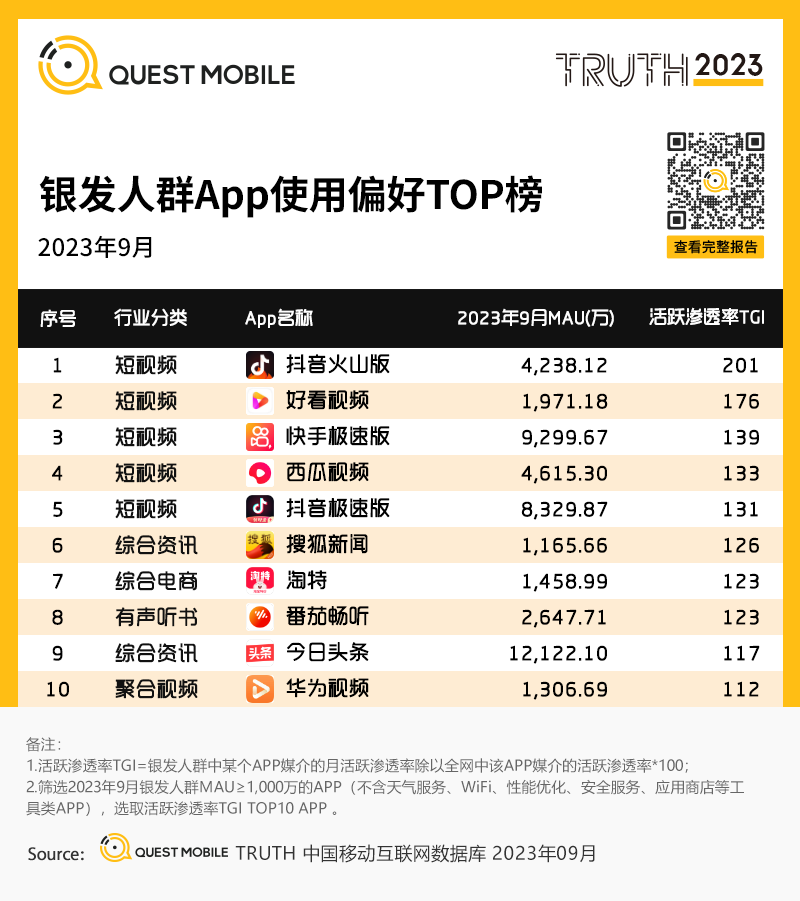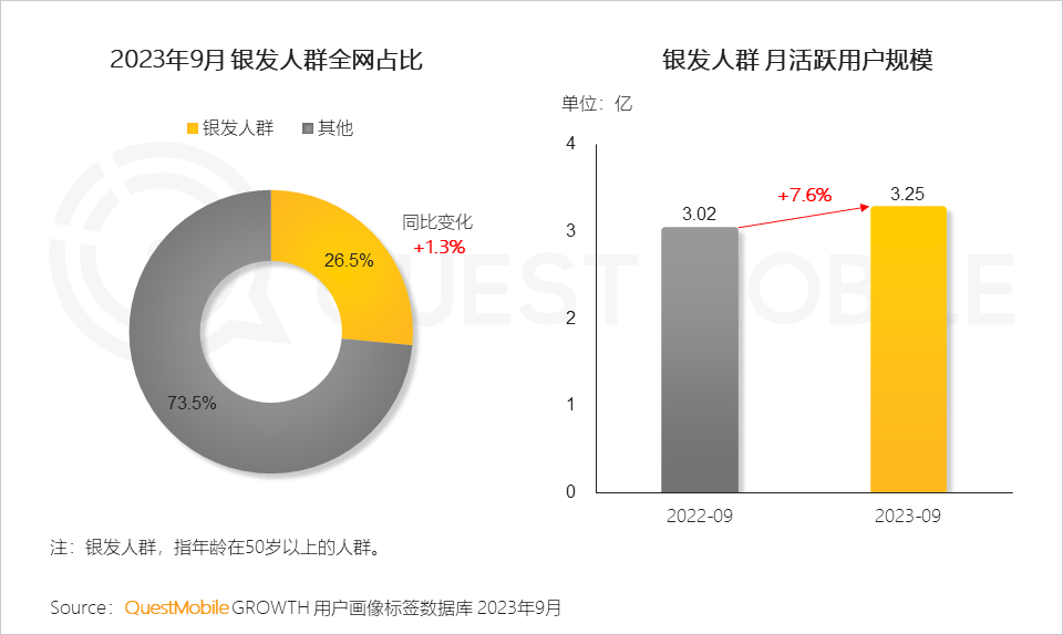 QuestMobile數(shù)據(jù)顯示,截止到2023年9月,銀發(fā)人群用戶規(guī)模已達(dá)到3.25億,同比增長了7.6%;全網(wǎng)占比已經(jīng)達(dá)到26.5%,同比提高了1.3個(gè)百分點(diǎn)。同時(shí),銀發(fā)群體線上消費(fèi)能力、消費(fèi)意愿也在提升,9月份,銀發(fā)人群千元以上消費(fèi)能力占比較去年同期增加了1.6%,中高端消費(fèi)意愿占比較去年同期增加了2.4%。銀發(fā)經(jīng)濟(jì)消費(fèi)潛力如何挖掘?不妨看報(bào)告吧。