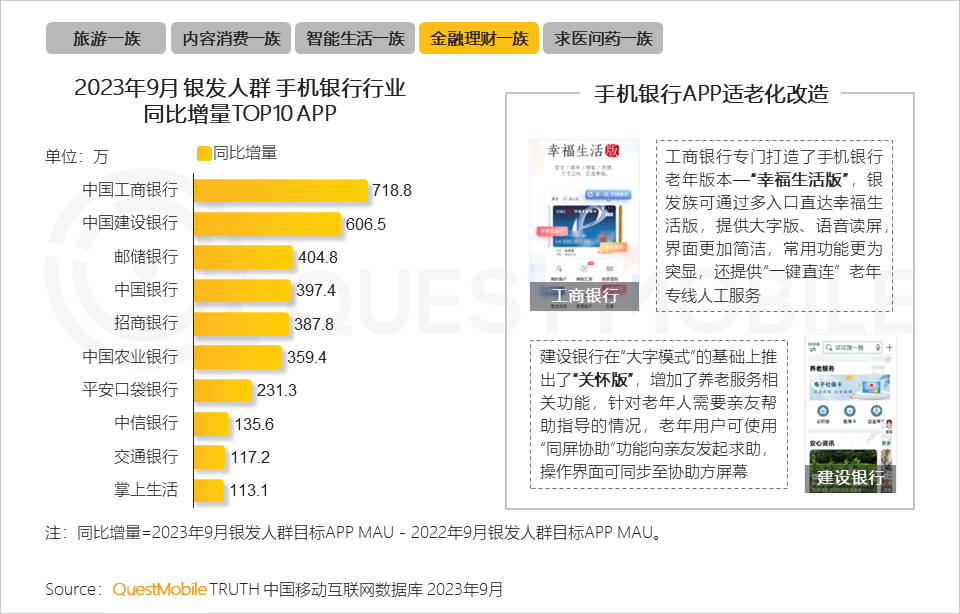 9、移動(dòng)支付方面,各大國有及股份制銀行加快完成適老化進(jìn)程,各手機(jī)銀行APP紛紛開發(fā)出適合老年群體的專屬界面,為銀發(fā)人群辦理金融業(yè)務(wù)提供更好的體驗(yàn),進(jìn)而進(jìn)一步獲得用戶擁躉。