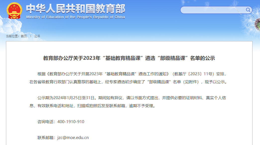 1月25日,教育部發(fā)布2023年“基礎(chǔ)教育精品課”遴選“部級(jí)精品課”名單公示,公示期為2024年1月25日至31日。本屆活動(dòng)全國(guó)共有6萬(wàn)多所學(xué)校的22萬(wàn)余名教師報(bào)名參與,通過(guò)教師自主申報(bào)、學(xué)校推薦、縣級(jí)初選、市省遴選等程序,各?。ㄗ灾螀^(qū)、直轄市)共推薦特殊教育精品課499節(jié)。在此基礎(chǔ)上,教育部組織專家從目標(biāo)內(nèi)容、教學(xué)過(guò)程、教學(xué)資源、技術(shù)規(guī)范等方面對(duì)推薦精品課進(jìn)行評(píng)審,最終公示了特殊教育類170節(jié)。