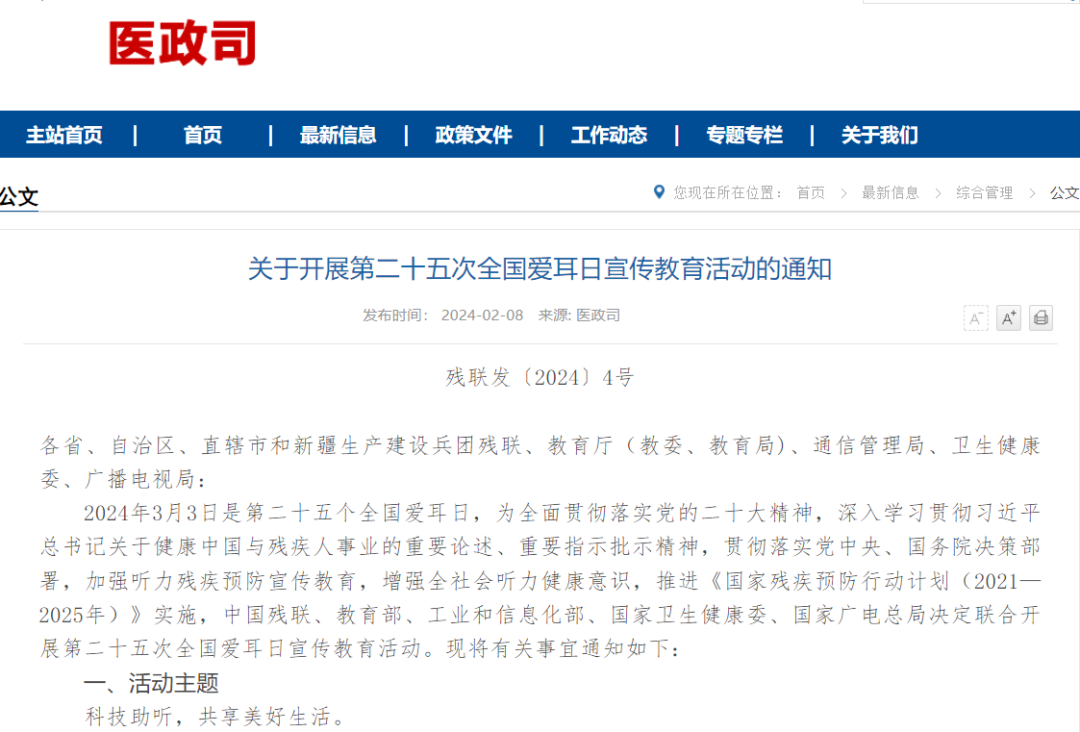 今年3月3日是第二十五個(gè)全國愛耳日,主題為“科技助聽,共享美好生活”。中國殘疾人聯(lián)合會(huì)、教育部、工業(yè)和信息化部、國家衛(wèi)生健康委員會(huì)、國家廣播電視總局日前聯(lián)合發(fā)布《關(guān)于開展第二十五次全國愛耳日宣傳教育活動(dòng)的通知》,旨在加強(qiáng)聽力殘疾預(yù)防宣傳教育,增強(qiáng)全社會(huì)聽力健康意識(shí),推進(jìn)《國家殘疾預(yù)防行動(dòng)計(jì)劃(2021—2025年)》實(shí)施。