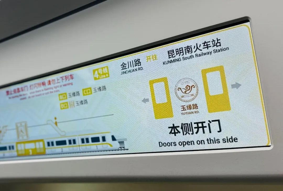 在車站內(nèi),昆明地鐵4號(hào)線公告欄新增公示公告適老化二維碼,乘客可通過掃描二維碼獲取具備大字、語音播報(bào)功能的公示公告;在列車上,新版列車動(dòng)態(tài)地圖固定顯示乘車信息、新增關(guān)鍵信息顯示、增大字體內(nèi)容;列車上可顯示新增服務(wù)熱線、各出入口周邊信息、設(shè)施信息等8個(gè)關(guān)鍵信息,以及車站衛(wèi)生間、站臺(tái)至站廳樓梯、扶梯、無障礙電梯等區(qū)域的位置;非開門側(cè)固定顯示線路圖,增大顯示對(duì)側(cè)開門信息,新增預(yù)計(jì)到站時(shí)間以及各換乘站換乘線路信息……