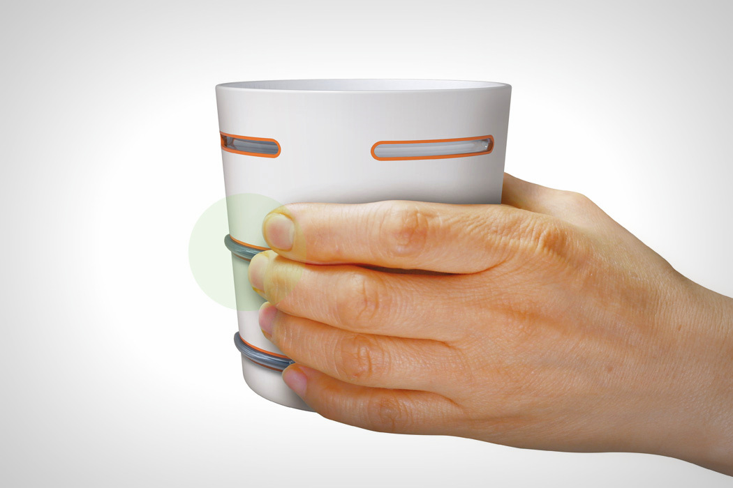 受酒吧杯具清潔器啟發(fā),這款無障礙飲水機讓用戶從杯子下部注水,使用者只需將特殊設計的杯子放在指定位置即可。按壓一次為冷水,兩次為熱水。飲水機的設定為每次只傾倒杯子容量80%的水,不用擔心溢出。