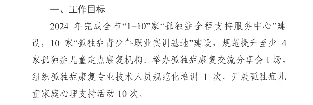 “持續(xù)提升孤獨癥早期篩查、診斷、康復(fù)水平,推進孤獨癥兒童融合教育,促進成年孤獨癥就業(yè),加強重癥孤獨癥托養(yǎng),做好孤獨癥民生兜底保障和無障礙環(huán)境建設(shè),建立完善我市孤獨癥全程支持服務(wù)體系。”