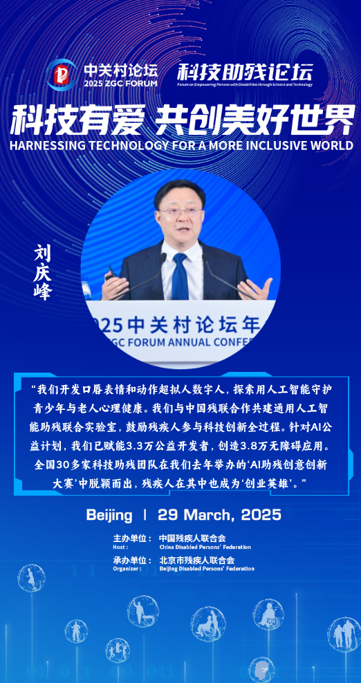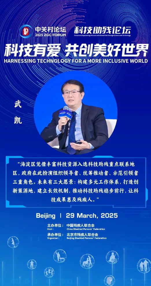 3月29日,由中國殘聯(lián)主辦、北京市殘聯(lián)承辦的2025中關村論壇年會科技助殘平行論壇在北京舉行。中國殘聯(lián)主席程凱出席論壇,中國殘聯(lián)黨組書記、理事長周長奎,北京市副市長馬駿,科技部五司司長鄭健出席論壇開幕式并致辭。