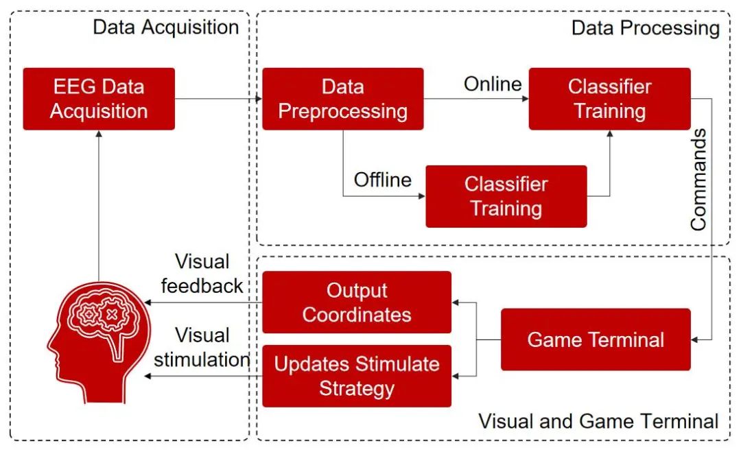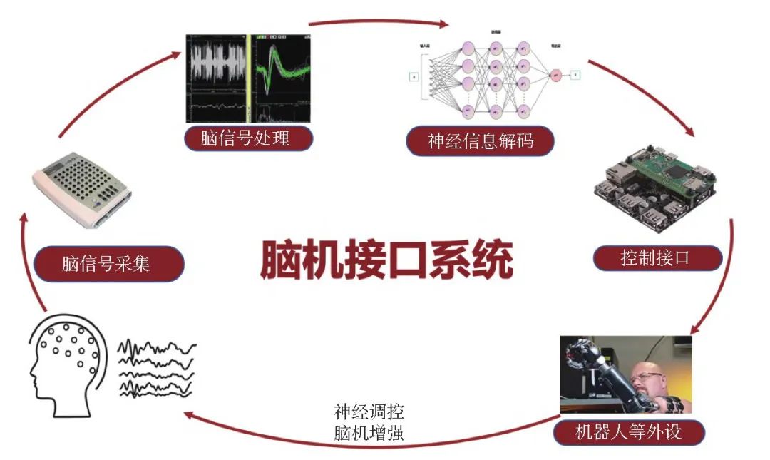 而腦機(jī)接口系統(tǒng)作為一種多學(xué)科交叉融合的復(fù)雜體系,其集成了神經(jīng)科學(xué)、信號(hào)處理、計(jì)算機(jī)科學(xué)、人工智能等多學(xué)科知識(shí),無(wú)論是侵入式還是非侵入式的腦機(jī)接口技術(shù),其系統(tǒng)都主要由用戶(hù)(大腦)、腦信號(hào)采集、腦信號(hào)處理與解碼、控制接口、機(jī)器人等外設(shè)和神經(jīng)反饋構(gòu)成。其中,最核心的組件是腦信號(hào)采集、腦信號(hào)處理與解碼以及控制接口三部分。