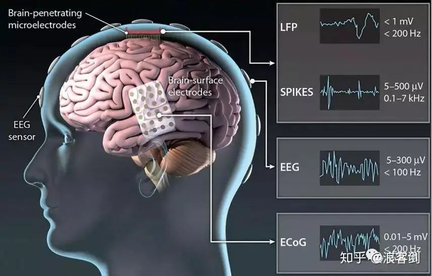 根據(jù)信號(hào)采集方式和技術(shù)的不同,腦機(jī)接口可分為非侵入式(腦外)、侵入式和半侵入式。非侵入式是指無(wú)需通過(guò)侵入大腦,只需要通過(guò)附著在頭皮上的穿戴設(shè)備來(lái)對(duì)大腦信息進(jìn)行解讀,常見(jiàn)技術(shù)為腦電圖(EEG);半侵入式則是將腦機(jī)接口植入到顱腔內(nèi),但是植入位置在大腦皮層之外,主要基于皮層腦電圖(ECoG)進(jìn)行信息分析;而侵入式則是通過(guò)手術(shù)等方式直接將電極植入到大腦皮層,微電極陣列(MEA)和神經(jīng)元放電檢測(cè)(SUA)則最為常見(jiàn),以此獲得高質(zhì)量的大腦神經(jīng)信號(hào)。