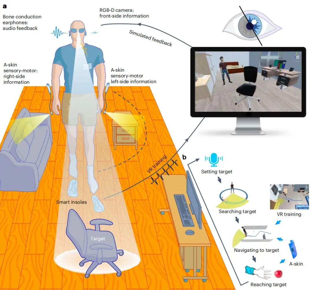近日,上海交通大學(xué)顧磊磊副教授團(tuán)隊(duì)聯(lián)合復(fù)旦大學(xué)、香港科技大學(xué)、華東師范大學(xué)等研發(fā)了一款融合AI和柔性電子的多模態(tài)可穿戴助盲系統(tǒng)。該系統(tǒng)整合視覺、聽覺和觸覺,以AI算法驅(qū)動(dòng)進(jìn)行環(huán)境監(jiān)測(cè),在穿戴者接近障礙物或物體時(shí)會(huì)通過骨傳導(dǎo)耳機(jī)進(jìn)行語音提示,向其發(fā)送信號(hào)。而貼在手腕的可伸展柔性電子皮膚則能有效探測(cè)障礙物,并進(jìn)行震動(dòng)提醒,以此提升佩戴者的周邊環(huán)境感知能力,從而實(shí)現(xiàn)移動(dòng)、抓取等視覺任務(wù),能有效輔助視障人群出行。