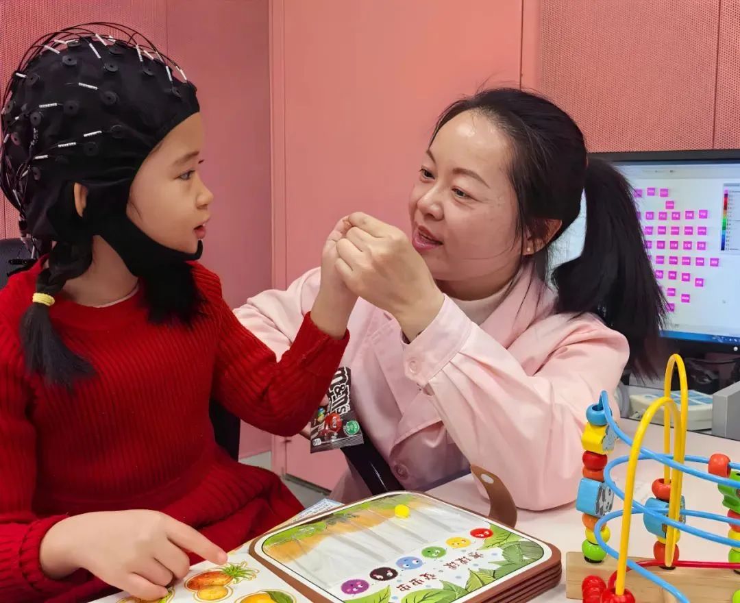 患有神經性耳聾的3歲女孩然然(化名)則在MMR(失匹配反應)精準言語聽覺訓練服務的幫助下,通過腦機設備和客觀評估檢測,提高了言語和聽覺感知能力。