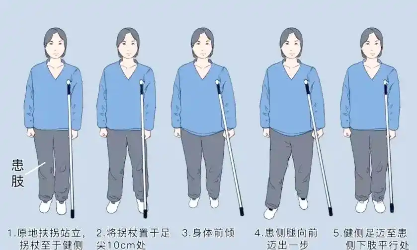 單拐步行技巧:將拐杖置于健側(cè),步行時(shí)應(yīng)遵循以下順序:先伸出拐杖,緊接著邁出患側(cè)腿,最后健側(cè)腿跟上,以保持平衡。雙拐步行技巧:在步行時(shí),首先將雙拐與患肢同時(shí)伸出,然后緊跟健側(cè)腿的邁出,以維持身體的平衡。請(qǐng)注意,患肢在此過程中需承擔(dān)部分體重。