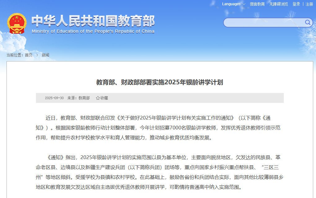 教育部、財(cái)政部計(jì)劃招募7000名銀齡教師