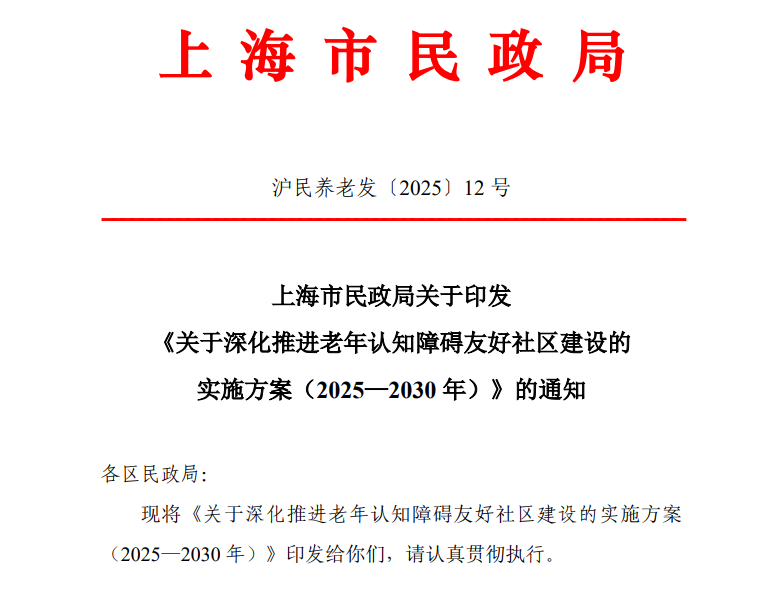 上海市民政局印發(fā)《關(guān)于深化推進(jìn)老年認(rèn)知障礙友好社區(qū)建設(shè)的實(shí)施方案(2025—2030年)》的通知,內(nèi)容包括加快健全三級(jí)老年認(rèn)知障礙支持網(wǎng)絡(luò)、完善全鏈條老年認(rèn)知障礙服務(wù)體系、加強(qiáng)老年認(rèn)知障礙友好氛圍營(yíng)造等方面。到2030年實(shí)現(xiàn)上海市全市老年認(rèn)知障礙社區(qū)干預(yù)機(jī)制全面有效建立,認(rèn)知障礙老年人及其家庭在社區(qū)普遍能便捷獲得支持關(guān)愛(ài),老年認(rèn)知障礙友好城市基本建成。60周歲以上老年人及其家庭對(duì)認(rèn)知障礙友好社區(qū)項(xiàng)目以及認(rèn)知障礙科普知識(shí)的知曉率達(dá)到80%等。