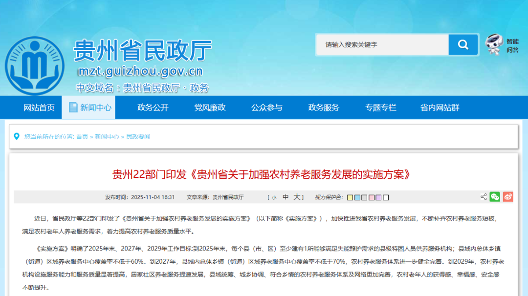 貴州22部門印發(fā)《貴州省關(guān)于加強(qiáng)農(nóng)村養(yǎng)老服務(wù)發(fā)展的實(shí)施方案》