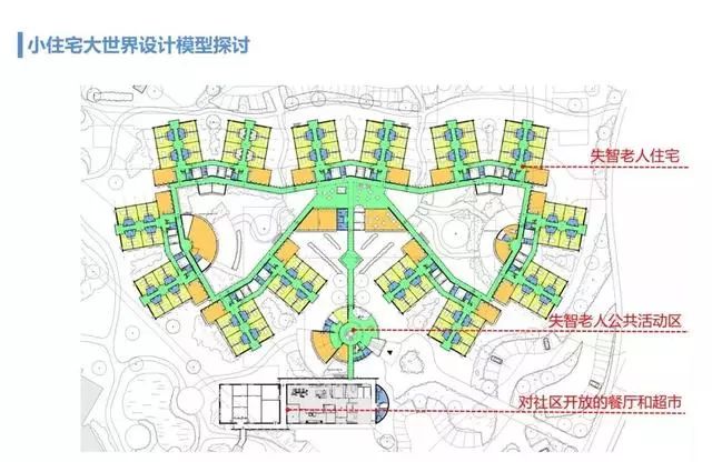 針對不同類型的老人,需要有不同的設計策略,不能把不同類型的失智老人混在一起,禪修型的需要一個安靜的角落,而浪人型則需要足夠的活動空間。荷蘭對失智癥老人的心理特征、需求的研究已經(jīng)形成了一套非常有特色的失智癥照護模式和設計模型,我們把這個模型叫做“小住宅,大世界”,老人們以6~8人為一個單元,共用一個大起居室。不同健康狀況的老人,活動范圍分為三個級別:病情重的只能在自己的單元里活動,狀況稍好的可以到別的單元里串門,級別最高的可以到達對外的公共餐廳和超市等區(qū)域,但不能走出養(yǎng)老院。