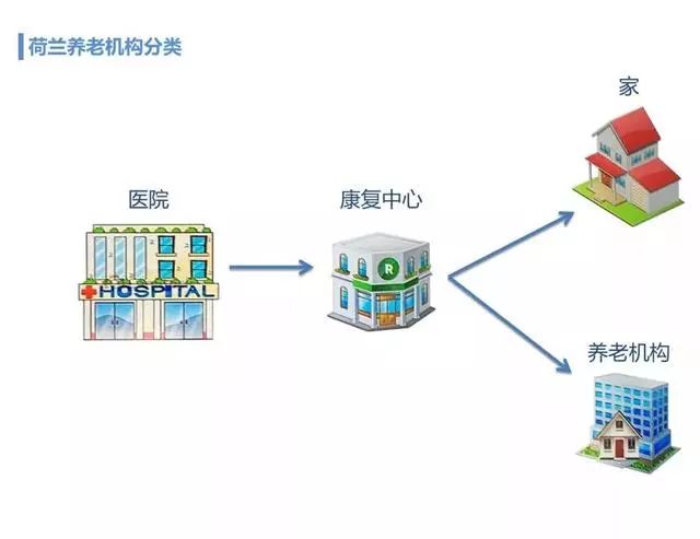荷蘭法律規(guī)定,醫(yī)院的住院時間不允許超過6天。6天之后必須出院。一些老人因為中風或骨折等疾病從醫(yī)院出院后,會被安排在康復中心進行為期2~8周最長不超過6個月的治療,康復中心在治療后,根據(jù)老人的恢復情況,再決定安排他們回家休養(yǎng),還是轉(zhuǎn)到養(yǎng)老護理機構。