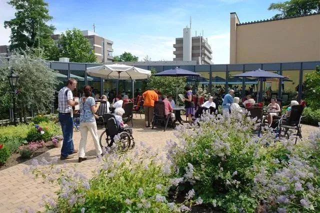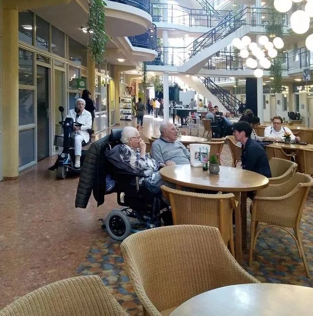 荷蘭的養(yǎng)老機構中除長期照護的養(yǎng)老院之外,還有一種主要類型就是針對可自理老人的生活支持型的養(yǎng)老公寓。這種機構一般會向老人提供包括餐飲、保潔、娛樂以及陪護等服務,并與醫(yī)院、居家護理機構保持緊密聯(lián)系,以中國人耳熟能詳?shù)?ldquo;荷蘭生命公寓”為代表。荷蘭生命公寓的建筑通常有個很大的特點,就是公寓的建筑圍合出一個很大的采光中庭,擁有體量很大的共享空間,里面各種活動非常豐富,并對周邊社區(qū)開放。