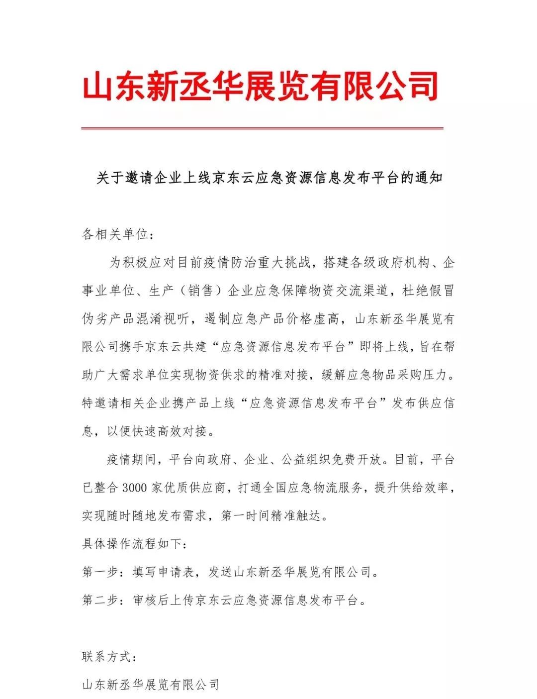 近日,疫情肆虐,多地應(yīng)急物資紛紛告急。為幫助各級政府 部門、醫(yī)療機(jī)構(gòu)實(shí)現(xiàn)物資供求信息的精準(zhǔn)對接,緩解疫情壓力,由京東團(tuán)隊(duì)研發(fā)“應(yīng)急資源信息發(fā)布平臺(tái)”及“智能情感客服”,山東新丞華展覽有限公司負(fù)責(zé)面向全國醫(yī)療衛(wèi)生機(jī)構(gòu)推廣,強(qiáng)強(qiáng)聯(lián)合,攜手打贏疫情阻擊戰(zhàn)。