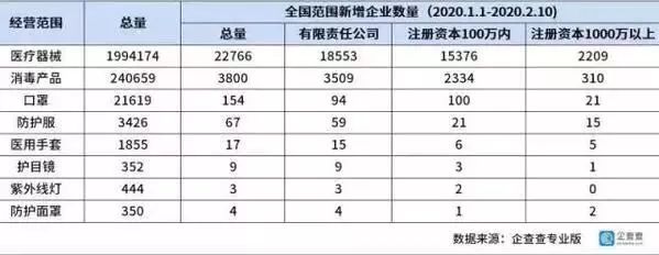 根據(jù)企查查專業(yè)版數(shù)據(jù)顯示,自2020年1月1日至2月10日,經(jīng)營(yíng)范圍涉及醫(yī)療器械、消毒產(chǎn)品等防護(hù)制品的企業(yè)增勢(shì)喜人,全國(guó)范圍內(nèi)醫(yī)療器械新增企業(yè)數(shù)超2萬(wàn)家,消毒產(chǎn)品次之。