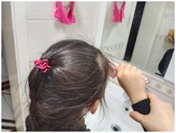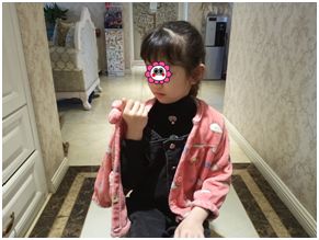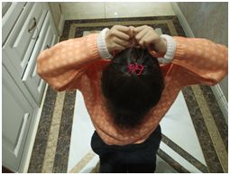 (3)梳頭訓(xùn)練:腦癱兒童在前方有鏡子的地方坐下,如果抓握困難,可以選擇加粗梳子把柄,家長(zhǎng)演示梳頭發(fā)動(dòng)作使腦癱兒童模仿,或者輔助下讓腦癱兒童上肢舉過頭頂做來回環(huán)轉(zhuǎn)動(dòng)作梳理頭發(fā)(如圖3-5)。