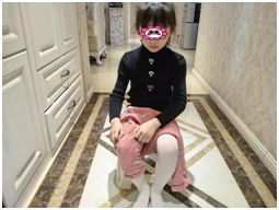 (5)穿褲子:兒童坐在凳子上,雙手抓住一側(cè)小腿使其交叉放在另一側(cè)大腿上(或一側(cè)下肢屈曲),把一側(cè)褲腿穿到腳踝以上或者膝蓋以上,交叉腿放下,另一側(cè)同上。穿好后站起,如果獨(dú)站不穩(wěn)的兒童可單手扶物,用一只手將褲子拉起至腰部(如圖2-11、2-12、2-13)。對(duì)不能獨(dú)坐凳子的腦癱兒童可以在床上進(jìn)行。