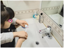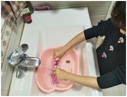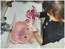 (1)洗臉訓(xùn)練:打開水龍頭放好水,兒童雙手捧水洗臉后,將小毛巾放進(jìn)盆里沖洗,兩手抓住毛巾擰出多余水分,將毛巾打開平放在手上擦臉(如圖3-1、3-2)。