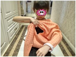 腦癱兒童坐在有靠背的椅子或小方凳上,雙腳平放在地上,衣物盡量選擇寬松版。(1)穿開衫:將上衣內(nèi)側(cè)朝外,衣領(lǐng)朝上(身體側(cè))放在膝蓋上,用較靈活的一只手(健手或功能較好的手)抓住衣領(lǐng),另一只手穿進(jìn)同側(cè)的袖口,較靈活的手將衣服拉上肩,再將領(lǐng)子繞過頭頂放到另外一個(gè)肩上,然后將此手穿進(jìn)袖子(如圖2-1、2-2、2-3)。