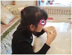 (1)飲水:飲水活動(dòng)時(shí),家長(zhǎng)輔助從溫水壺里向水杯倒水,腦癱兒童可雙手抓握水杯把手(或雙手半握拳捧住杯體),雙肘關(guān)節(jié)屈曲至嘴邊將水送入口中吞咽。對(duì)于雙手抓握功能較差的腦癱兒童,可以使用吸管飲水(如圖1-1、1-2)。