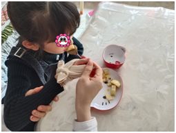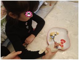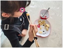 (2)進(jìn)食:進(jìn)食固體或半固體食物時(shí),家長(zhǎng)輔助下將食物盛入合適的碗里放在桌上,對(duì)于抓握較差的腦癱兒童,可以用繃帶固定手抓握勺子,家長(zhǎng)一手輔助腦癱兒童前臂旋前、旋后,一手環(huán)轉(zhuǎn)腕關(guān)節(jié)將食物舀起送入口中(如圖1-3、1-4),反復(fù)練習(xí),提高其進(jìn)食能力。對(duì)于能力稍好的腦癱兒童,可以選取簡(jiǎn)單改裝的筷子,如兩根筷子頂部用橡皮筋各纏繞兩圈固定的方式夾取食物進(jìn)食(如圖1-5、1-6)。