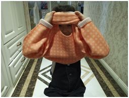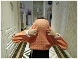 (3)穿套頭衫:將套頭衫的背面朝上,衣領(lǐng)朝下放在膝蓋上,雙手將衣服后背卷起直到露出袖口,一只手穿到相應(yīng)的袖口,拉上衣袖直到露出前臂,另一側(cè)同樣的動(dòng)作,然后將領(lǐng)子和衣服下緣拉在一起,將頭套入領(lǐng)口,將衣襟拉下即可(如圖2-6、2-7、2-8)。