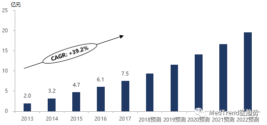 ▲中國(guó)醫(yī)療機(jī)器人市場(chǎng)規(guī)模,2013-2022預(yù)測(cè)