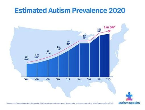 美國(guó)疾病預(yù)防控制中心(CDC)日前發(fā)布的數(shù)據(jù)顯示:在美國(guó),每54個(gè)兒童中就有1名患有自閉癥(1:54),自閉癥患病率比2016年提高了近10%。