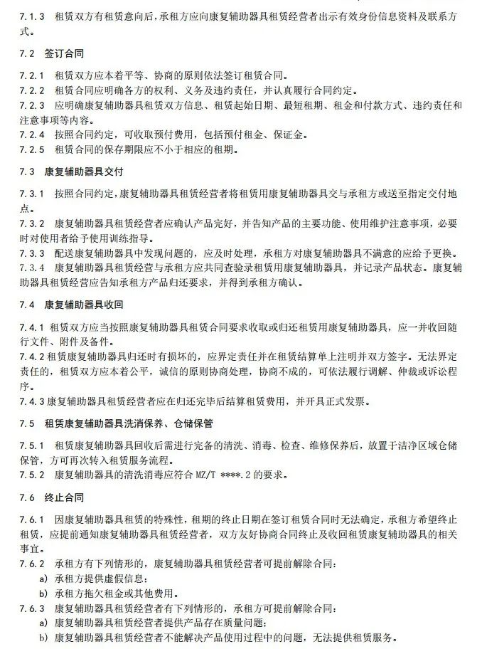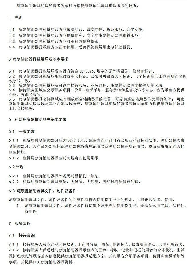 該意見稿從租賃場所、租賃用康復(fù)輔具、服務(wù)流程、租賃費(fèi)用結(jié)算、租后服務(wù)、投訴與處理、人員培訓(xùn)等7個方面規(guī)定了康復(fù)輔具租賃服務(wù)的基本要求。