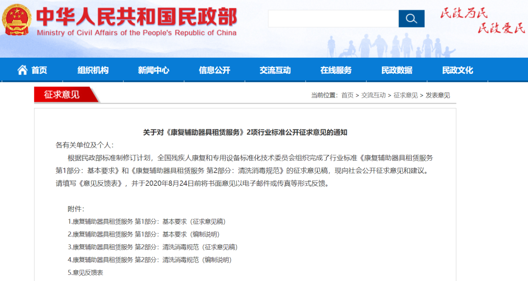 昨日下午,民政部網(wǎng)站最新發(fā)布了《康復(fù)輔助器具租賃服務(wù) 第1部分:基本要求》和《康復(fù)輔助器具租賃服務(wù) 第2部分:清洗消毒規(guī)范》行業(yè)標(biāo)準(zhǔn)征求意見稿。